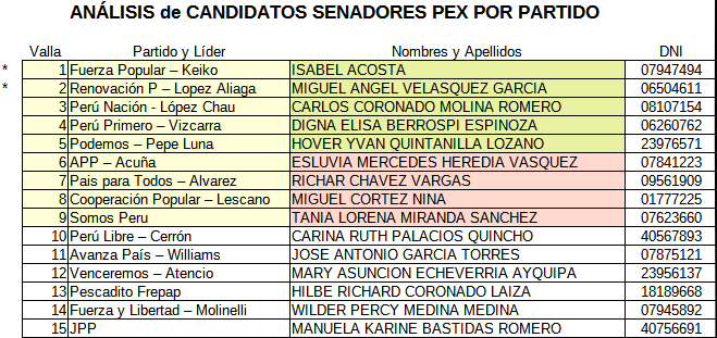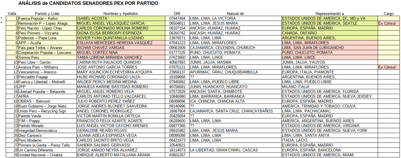 De acuerdo con la relación oficial de candidatos inscritos, de los 38 partidos en total, 29 lograron inscribir candidatos apurada y desordenadamente. Hoy compiten por escaños en la circunscripción PEX, como que quisieran ganarse la lotería probando suerte. Tres de cada cuatro candidatos tienen domicilio declarado en Perú (Lima, Miraflores, Huaraz, Cajamarca, Puno, entre otros). Solo un reducido número declara residencia real en países de la diáspora, como Estados Unidos (Maryland, Seattle, Ontario), España (Madrid), Argentina (Buenos Aires) o Canadá.