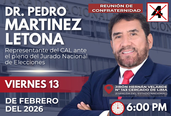 El Colegio de Abogados de Lima debe ser un faro de confianza para la sociedad y un respaldo sólido para quienes ejercemos la abogacía. La historia nos juzgará no por lo que dijimos, sino por lo que hicimos para preservar la esencia de nuestra profesión. Invito a todos los agremiados a marcar el número 4 este domingo 15 de febrero en la Universidad Nacional Mayor de San Marcos, de 8:00 a.m. a 4:00 p.m. Juntos recuperamos el liderazgo y la dignidad del gremio.Dr. Pedro Antonio Martínez Letona PhD