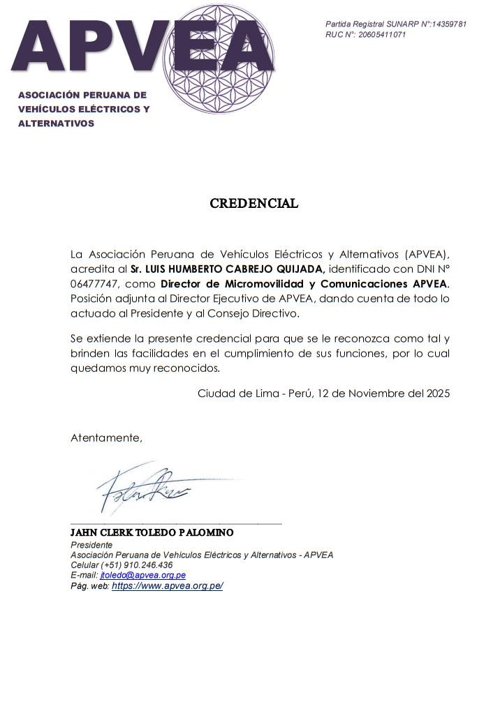 Antes de hacer el anuncio formal debemos comentar que APVEA son las siglas de "Asociación Peruana de Vehículos Eléctricos y Alternativos". Quienes tiene la función de promover la adopción segura y eficiente de la electromovilidad. A través de la difusión de conocimiento técnico y la promoción de estándares de calidad, buscamos garantizar la seguridad de estos vehículos y fomentar la confianza en esta tecnología. Es debido a ello que nuestro Gerente Comercial, Luis Alberto Cabrejo ha aceptado el reto y desde este mes es el actual Director en Micromobilidad Nacional en APVEA.