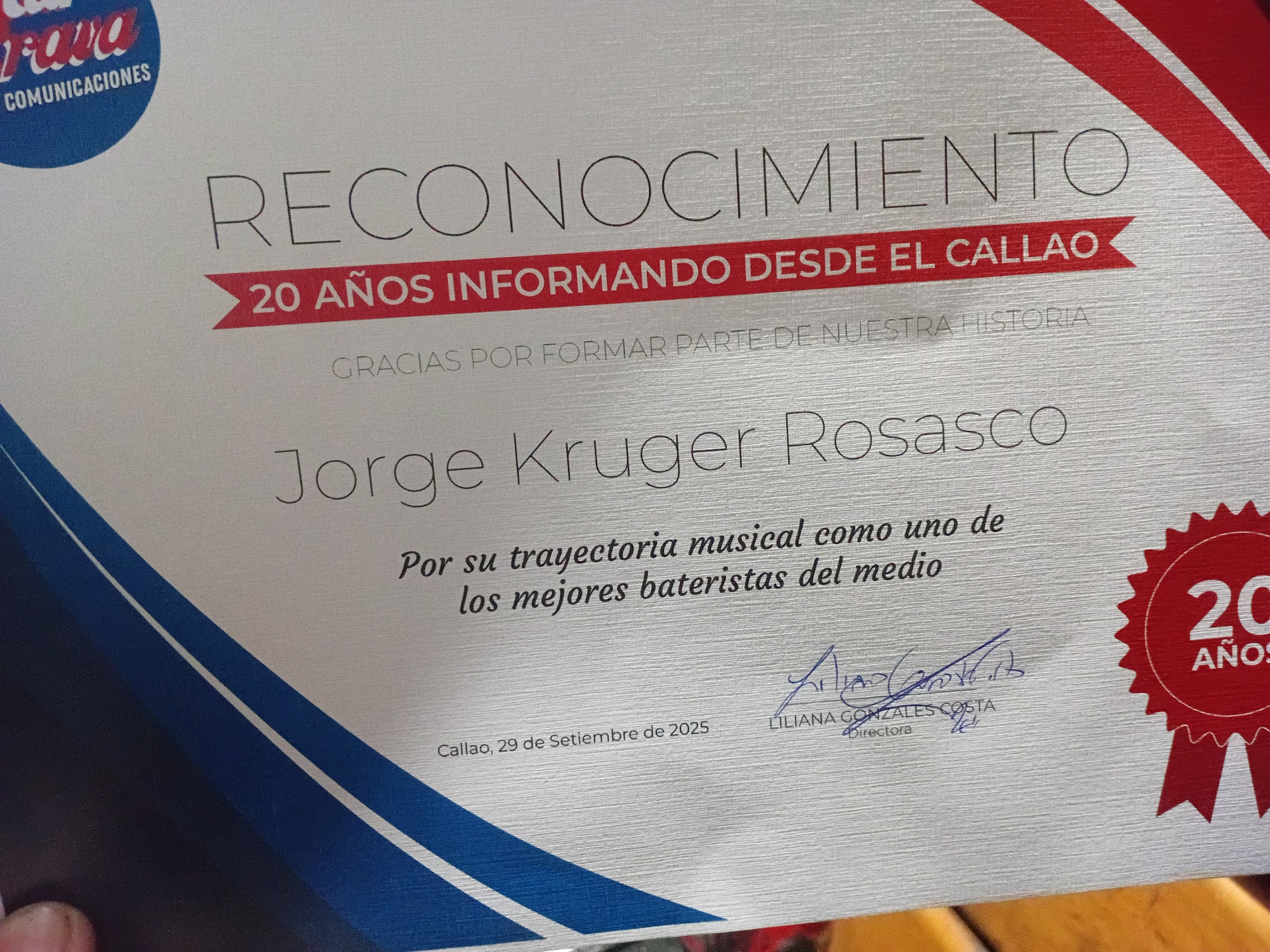 Mar Brava Comunicaciones del Callao, una página dedicada a informar y resaltar los logros de los artistas nacionales, reconoció recientemente la trayectoria musical de dos músicos de quienes ya hemos hablado en reportajes anteriores. Se trata de Jorge Kruger Rosasco y su hermano Herbert Kruger Rosasco, ambos integrantes de la bandas Hena y Quasar entre otras. Este reconocimiento fue entregado por la directora periodística de la página, la licenciada Liliana González Costa.