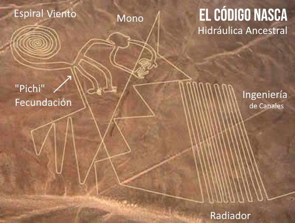 Esta foto no es casual. Es una llamada: los geoglifos nazca son mapas funcionales de ingeniería hidráulica, no solo arte. El Mono riega agua eterna, fecunda Pachamama, controla flujo con canales – y en el Código Nasca 2.0, lo reviven en tecnología soberana.