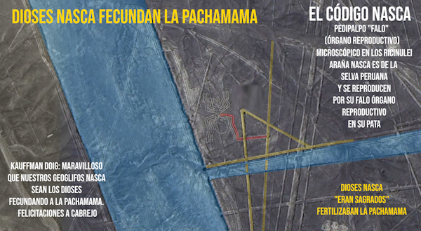 Para el autor, muchos geoglifos son ofrendas para reverdecer el desierto, donde el agua actúa como el “semen” que penetra y da vida a la tierra. La Araña y el Mono: Tejedora y Regadora, La araña teje la red invisible (conexiones de acuíferos) como si fuera su telaraña.