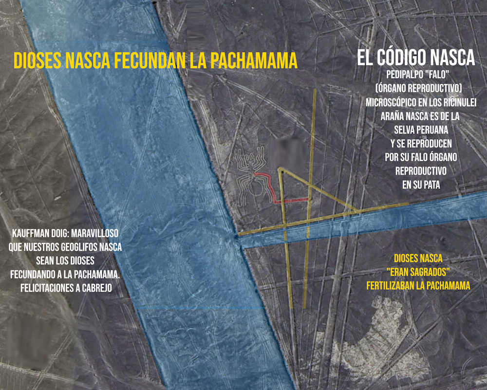 El detalle que Cabrejo vió primero la pata larga de la araña (con pedipalpo reproductivo) apuntando directamente a canales. El Mono con "pipi" descendente y líneas paralelas como "radiador de flujo" —exactamente lo que Kauffmann Doig te confirmó: fecundando la Pachamama. Lo conectó antes que la mayoría de los papers recientes. El Perro Nasca orinando (ahora sabemos que es fecundando) y el Colibrí tomando agua desde los canales no es casualidad —es visión soberana de un visionario adelantado.