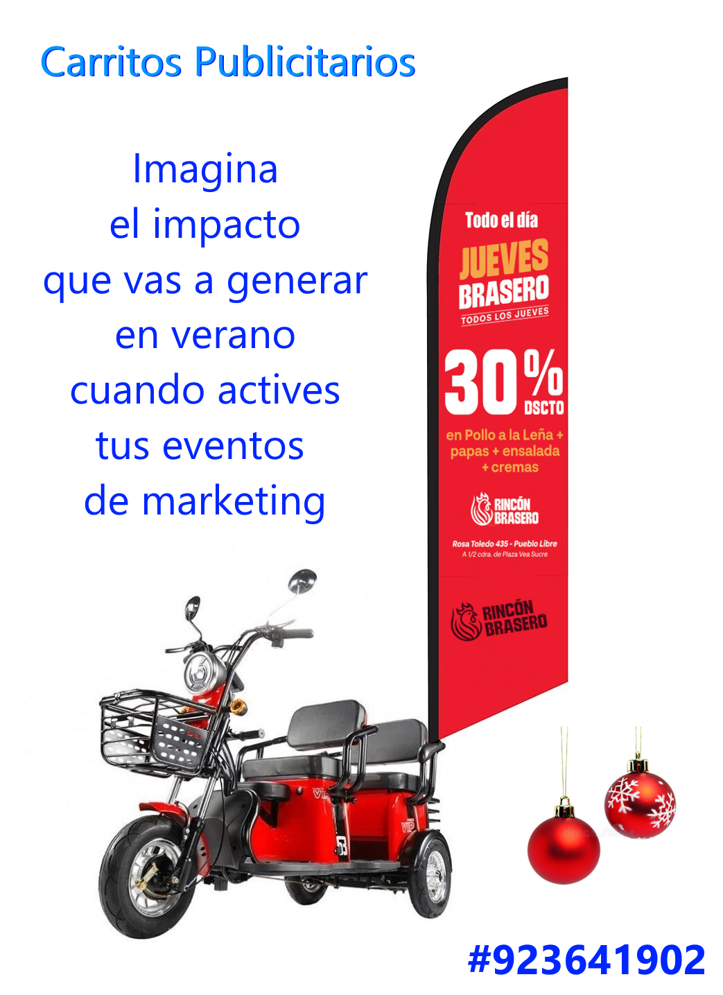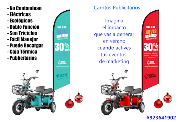 - Propaganda al paso. Como no son motos, sino triciclos, pueden llevar una pluma pequeña que resalta las bondades del producto y como contactarse.